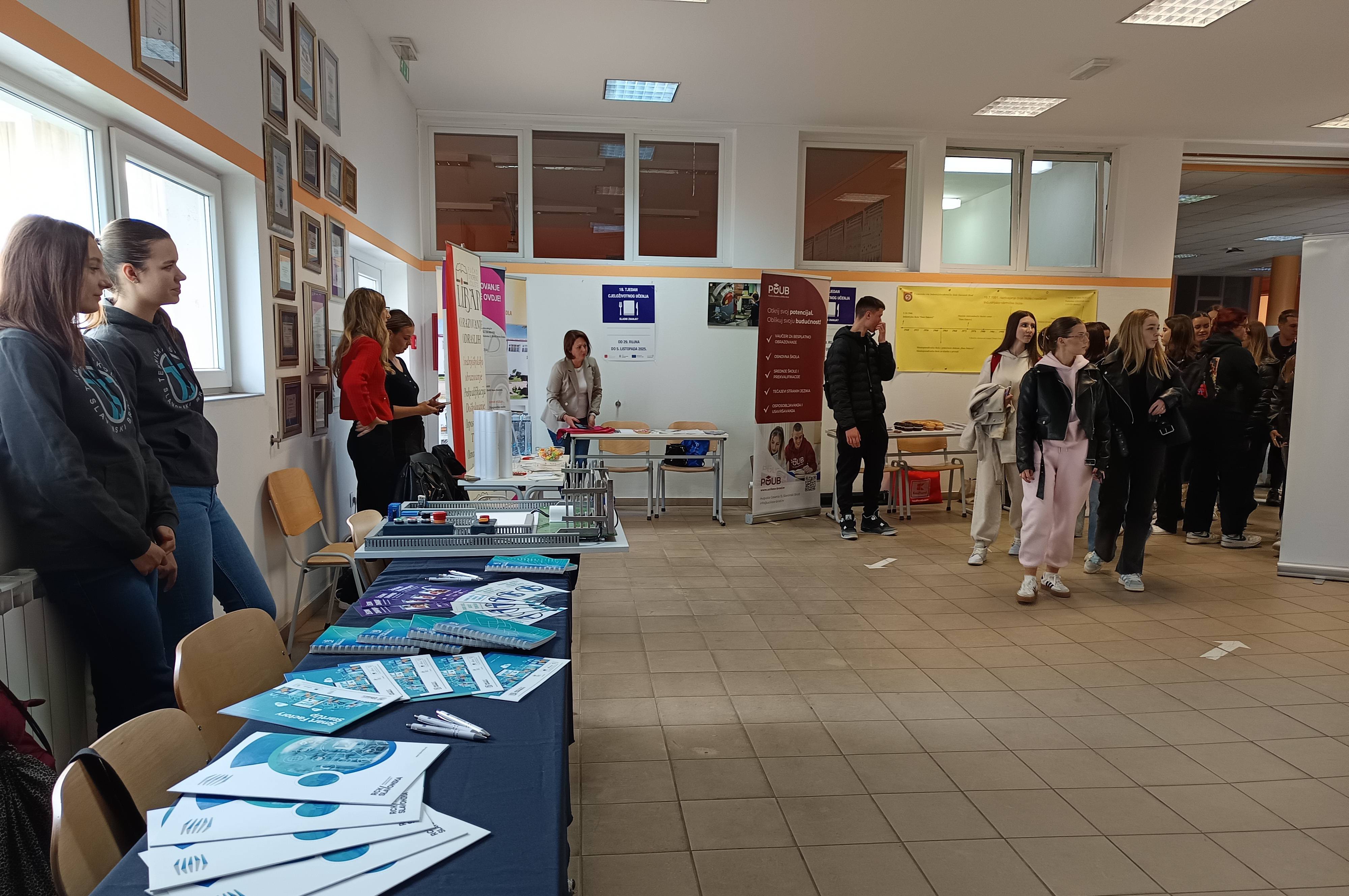 Naša škola je bila domaćin Sajma cjeloživotnog učenja, u srijedu, 1. listopada 2025.g. u vremenu od 10,00 do 12,00 sati. Ugostili smo više različitih izlagača, koji su predstavljali svoje aktivnosti vezane za obrazovanje odraslih: Tehničku školu Slavonski Brod, POU LIbar, POU Brod, POU AMC Nova Gradiška, CISOK i MEDskills Slavonski Brod.